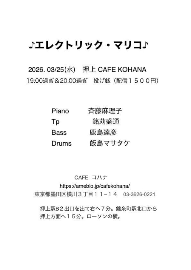 弊店ライブに出演いただいております、「エレクトリック・マリコ」様の特別動画、2026年3 月バージョンです。 本ポスターをご購入いただきますと、特典として3/25(水)19:00頃から開催されるライブ配信のURLが記載されているPDFが付いてまいります。 なお、アーカイブは一か月程度保存されます。