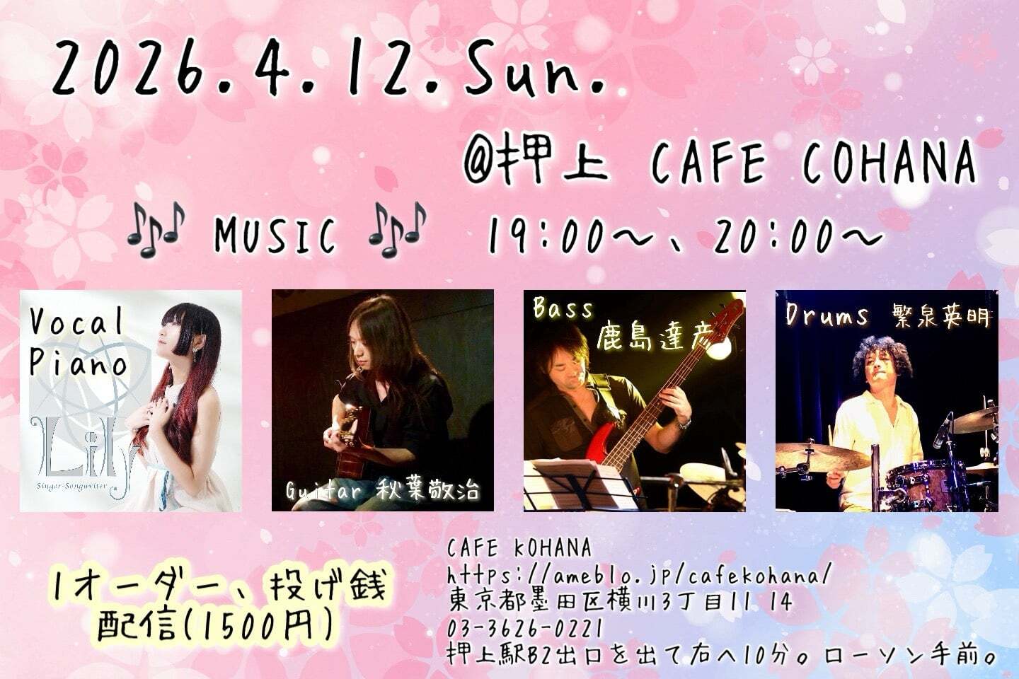 弊店ライブに出演いただいております、「Lilyバンド」様の特別ポスター、2026年4月バージョンです。